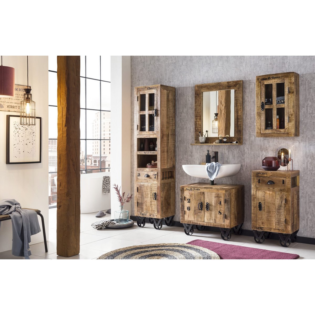 Mit diesem Bad Set aus einer Kombination aus recyceltem Mangoholz und Metallbeschlägen in antikschwarz holen Sie sich rustikalen Charme in Ihr Badezimmer. Das verwendete Holz stammt von alten Scheunen, Häusern und Reiströgen und ist besonders stark und widerstandsfähig. Durch die naturgemachte Witterung entsteht ein besonders warmer Farbton. Abgerundet wird der industrielle Look durch schwarze Aufdrucke, die an Transport- und Lagerkisten erinnern. Die handgeschmiedeten Rollen und Beschläge passen ideal in die industrielle Themenwelt, die diese Möbelserie erzählt. Durch die Rollen stehen die Möbel leicht erhöht, was eine gute Luftzirkulation im Bad ermöglicht und außerdem die Reinigung des Bodens erleichtert. Ein Hochschrank, eine kleine Kommode, ein Hängeschrank und der Waschbecken-Unterschrank bieten genug Platz für Handtücher, Putzmittel und Co, dazu noch ein Spiegel mit Ablage. Hochschrank 44x34x191 cm, Unterschrank 66x43x61 cm, Spiegel 67x12x80 cm, kleiner Schrank 44x34x82 cm, Hängeschrank 44x21x70 cm.