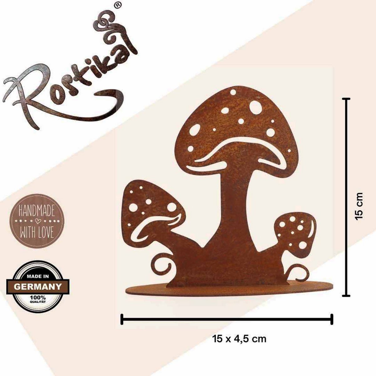 Pilzsammler aufgepasst - Edelrost Herbstdeko aus Metall bei Rostikal Verzieren Sie den Hauseingang, Ihre Kommode, Fensterbänke oder Treppen mit den rostigen Pilzen. Die Deko Schwammerl sind als Wohn- und Gartendeko geeignet. ➤ Warum Pilze für Ihre Herbstdeko mühsam suchen? Bestellen Sie einfach bequem online. Maße: Höhe: ca. 15 cm ✓ Breite: ca. 15 cm ✓ Bodenplatte: ca. 3 x 11 cm ✓ Eigenschaften:Die Dekopilze werden von Hand aus Metall angefertigt. Die Rostpatina entsteht durch ein spezielles Finish. Perfekt also für Ihre herbstliche Dekoration im Haus und im Garten. Ihre Vorteile bei uns: Bequem online bestellen oder Vorort abholen. Sie finden bei uns einzigartige Geschenkidee aus Edelrost. ​Wir stellen Qualitätsarbeit von Hand her - Made in Germany.