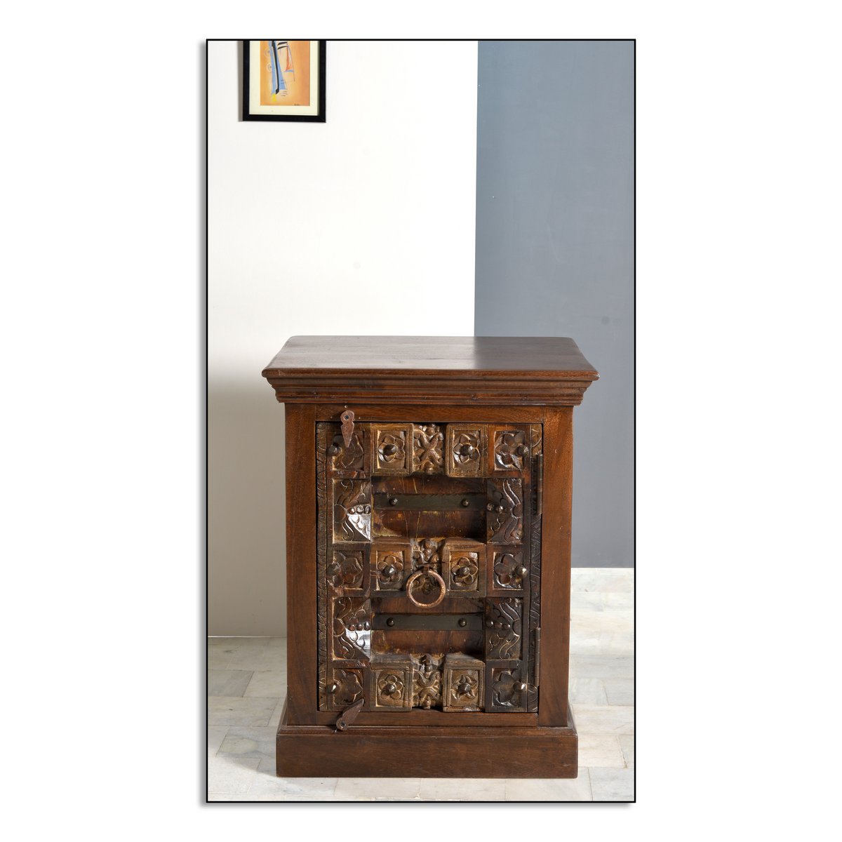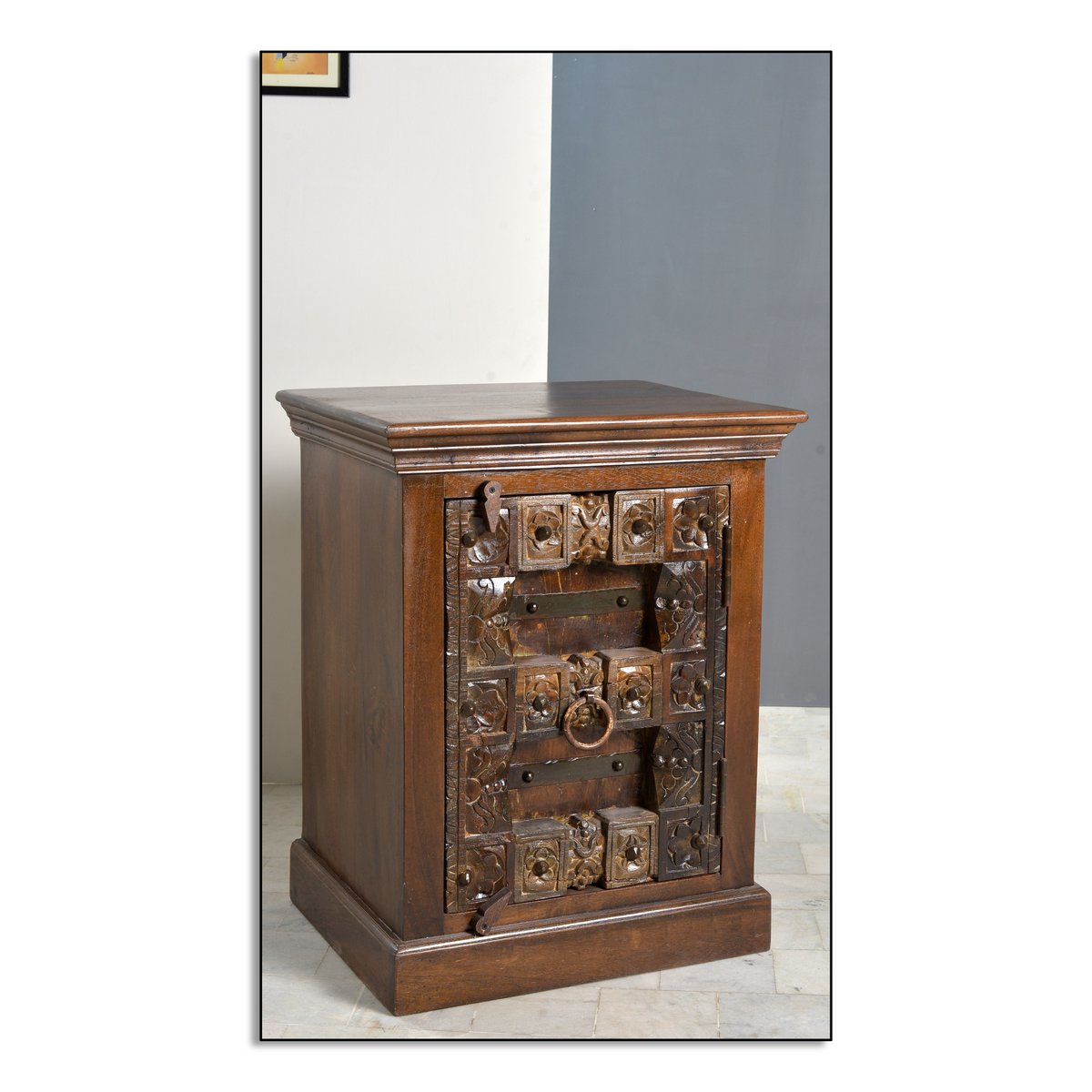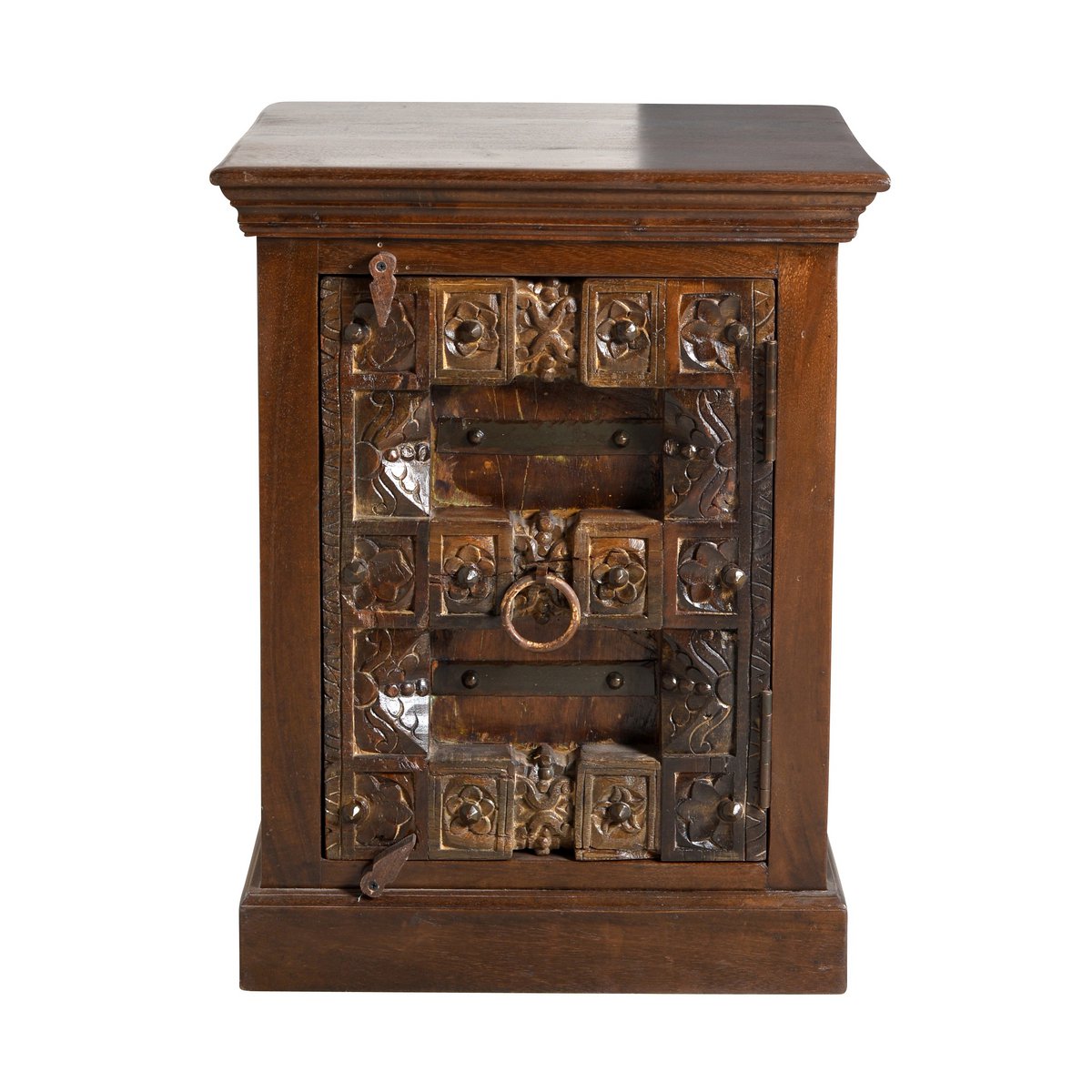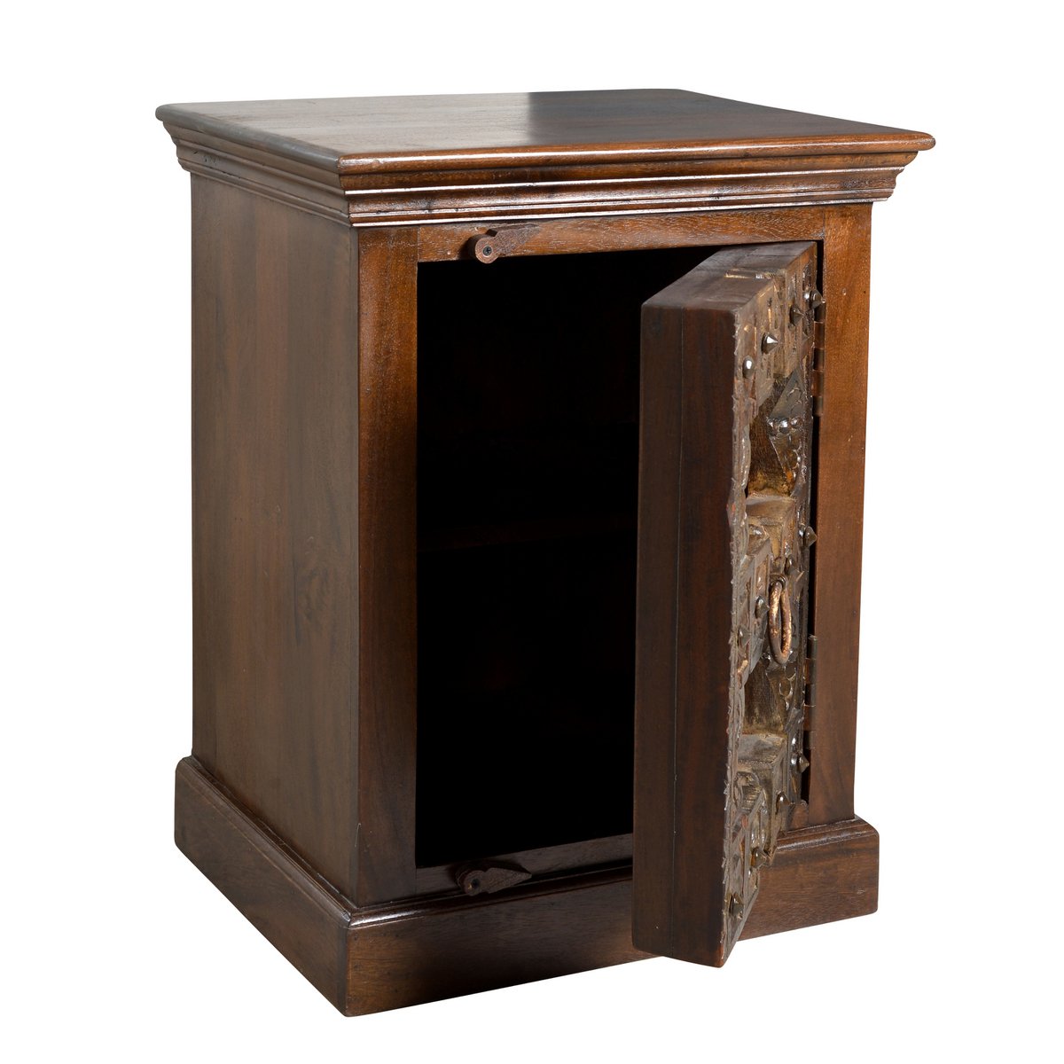 Aufwändige Schnitzereien auf recyceltem Altholz mit Metallapplikationen geben der Front dieser Nachtkonsole den für Indien typisch antik kolonialen Look. Hinter der Tür der Nachtkommode befindet sich Platz für Bücher und private Dinge. Eine ausreichende Fläche für Nachttischlampe, Wecker, Bücher, Lesebrille usw. bietet die Deckplatte. Der Nachtschrank lässt sich auch prima als Einzelstück in weiteren Wohnräumen aufstellen z. B. als Dielenschrank oder kleine Flurkommode und kann dort mit ihrem Charme ganz groß rauskommen. Die Kommode ist kombinierbar mit modernen Möbeln in Schlafzimmern. Das Schränkchen würde seine Wirkung in kleinen Single-Haushalten als Nischenfüller ebenso entfalten. 1 Boden, Fachinnenmaße 43,5x37x31,5 cm.