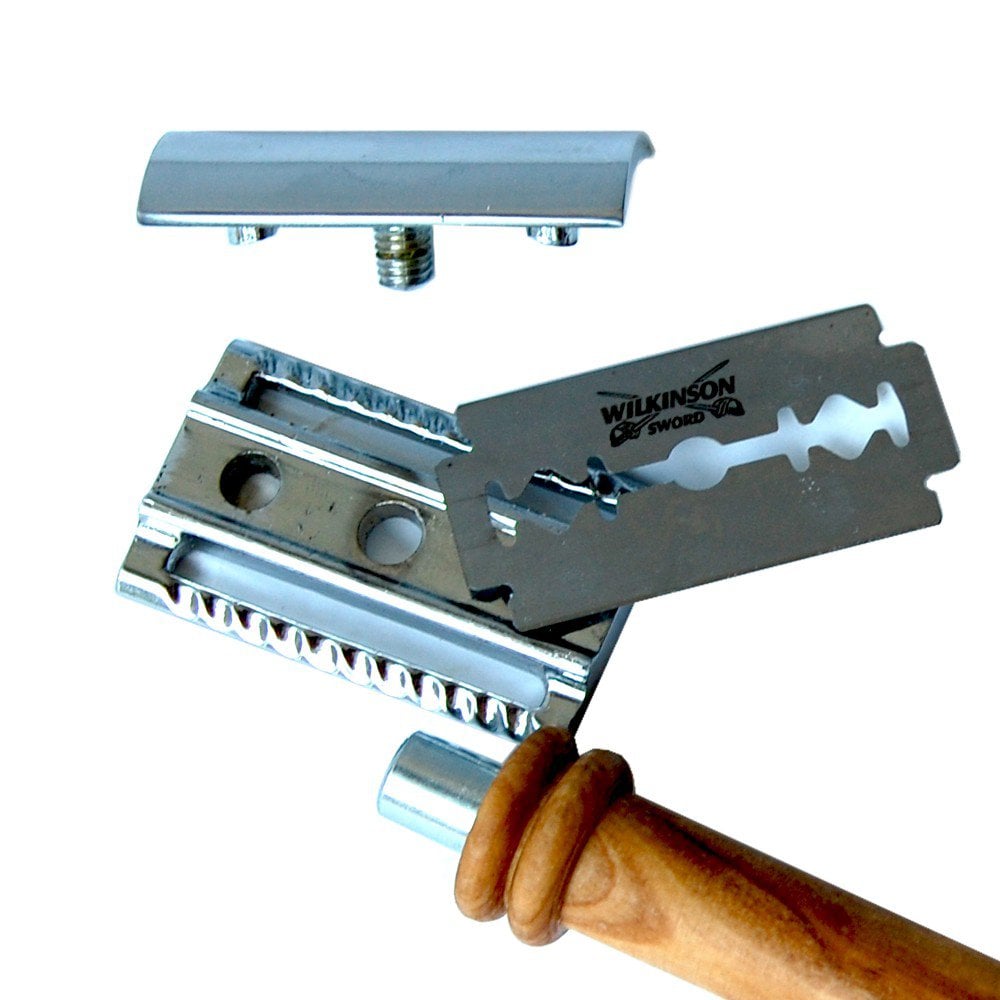 Rasierhobel KLASSIK in verschiedenen Griffvarianten aus Olivenholz, hier mit dem Griff WATZMANN. Der traditionelle Hobel mit auswechselbarer Klinge gilt vielen als der erste mechanische "Rasierapparat" zur Selbstrasur. Hochwertig verarbeitet und mit einer besonders feinen Ziselierung, verchromt. Mit geschlossenem Kamm für eine besonders sanfte Rasur. Als Rasierhalter empfehlen wir unsere Modelle AMRUM oder SYLT für einen guten Halt des Rasierhobels. Es passen alle Plattklingen verschiedenster Marken.