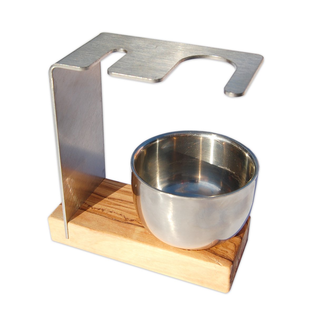 Rasierpinselhalter für den gepfelgten Mann. Gebürstetes Edelstahl kombiniert mit Olivenholz! Diese hochwertige Halterung nimmt sowohl Ihren Nassrasierer als auch Ihrem Rasierpinsel auf. In diesem Set bekommen Sie zudem einen hochwertigen Rasiertiegel aus Edelstahl. Die Set ist ein modernes Accessoir im Bad. Diese Halterung ermöglicht das gute Abtrocknen vom Rasierer und vom Rasierpinsel nach der Rasur. Die Halterung ist ausgelegt alle gängigen Marken von Nassrasierern und Rasierhobel sowie für Rasierpinsel mit Griff-Durchmesser von bis zu 3,2 cm.