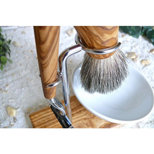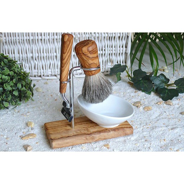 Rasierpinselhalter KLASSIK PLUS inkl. Pinsel & Nassrasierer Ein modern-stilvolles Team im 3er Set... ...und als Geschenk für den Mann ein echter Renner! Modern und futuristisch ist dieser Rasierpinselhalter auf einer Platte aus Olivenholz und dazu passend eine moderne, abgeschrägte Rasierschale aus Porzellan. Die edel anmutende Kombination, aus einem M3-Nassrasierkopf mit auswechselbarer Klinge und einem handschmeichelnden Griff aus Olivenholz, macht diesen Nassrasierer zu einem wahren Schmuckstück. Der handgefertigte Rasierpinsel - eine Kombination aus wunderschönem Olivenholz und echtem Dachshaar - schmeichelt der Haut ganz besonders durch die Weichheit des Haares. Größe/Maße/Gewicht Rasierpinselhalter KLASSIK PLUS Höhe ca. 12 cm Länge ca. 14 cm Breite ca. 7 cm Rasierschale Porzellan (schräg) Höhe ca. 4,5 cm Durchmesser ca. 10 cm Rasierpinsel Länge ca. 9 cm Nassrasierer Olivenholzgriff: Länge ca. 9 cm, Breite ca. 2 cm M3 Rasierkopf: Länge ca. 4,5 cm