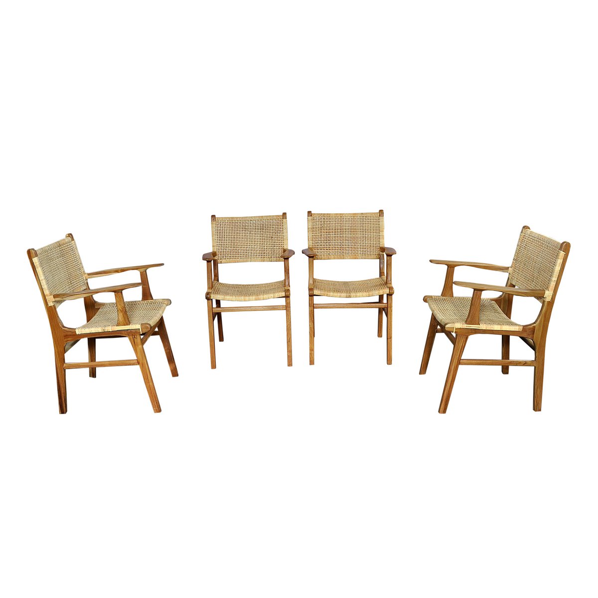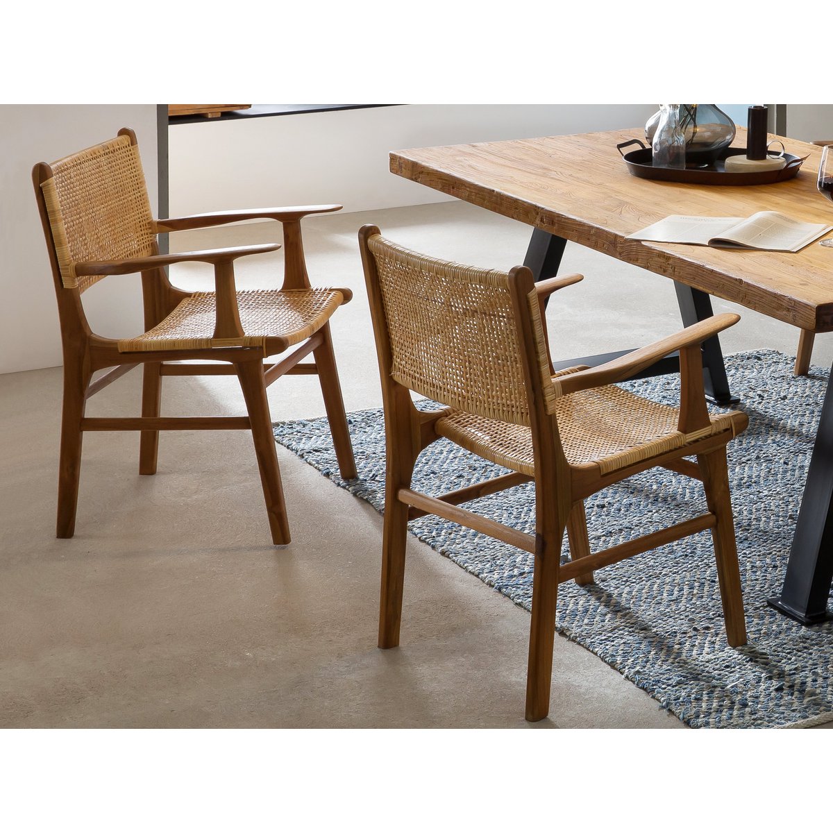 Das von sich aus schon edle Holz Teak, gestaltet mit einem Wiener Geflecht aus Peddigrohr in Sitz-und Rückenteil, ergibt einen wunderschönen Stuhl in der Farbe der Natur. Der Armlehnstuhl, welcher einem Kaffeehausstuhl gleicht, ist handgefertigt und passt sich dank seines warmen und exotischen Charmes jeden Wohnbereich an. Kombiniert zu factory Design oder Vintage, antik und rustikal, diese Sitzgelegenheit passt immer. Dekoriert mit einem hübschen Kissen als Einzelstuhl im Gästezimmer oder Schlafzimmer. Im Esszimmer und Wohnbereich bietet er einen bequemen Sitzplatz für Ihre Gäste. In großen Dielen oder Fluren, auf der Terrasse oder im Wintergarten bietet dieser Stuhl mit seiner wunderschönen naturbelassenen Optik einen Platz zum Ausruhen. Sitzhöhe 45 cm, Sitztiefe 42 cm, Sitzbreite 51 cm, Höhe der Armlehnen 68 cm.