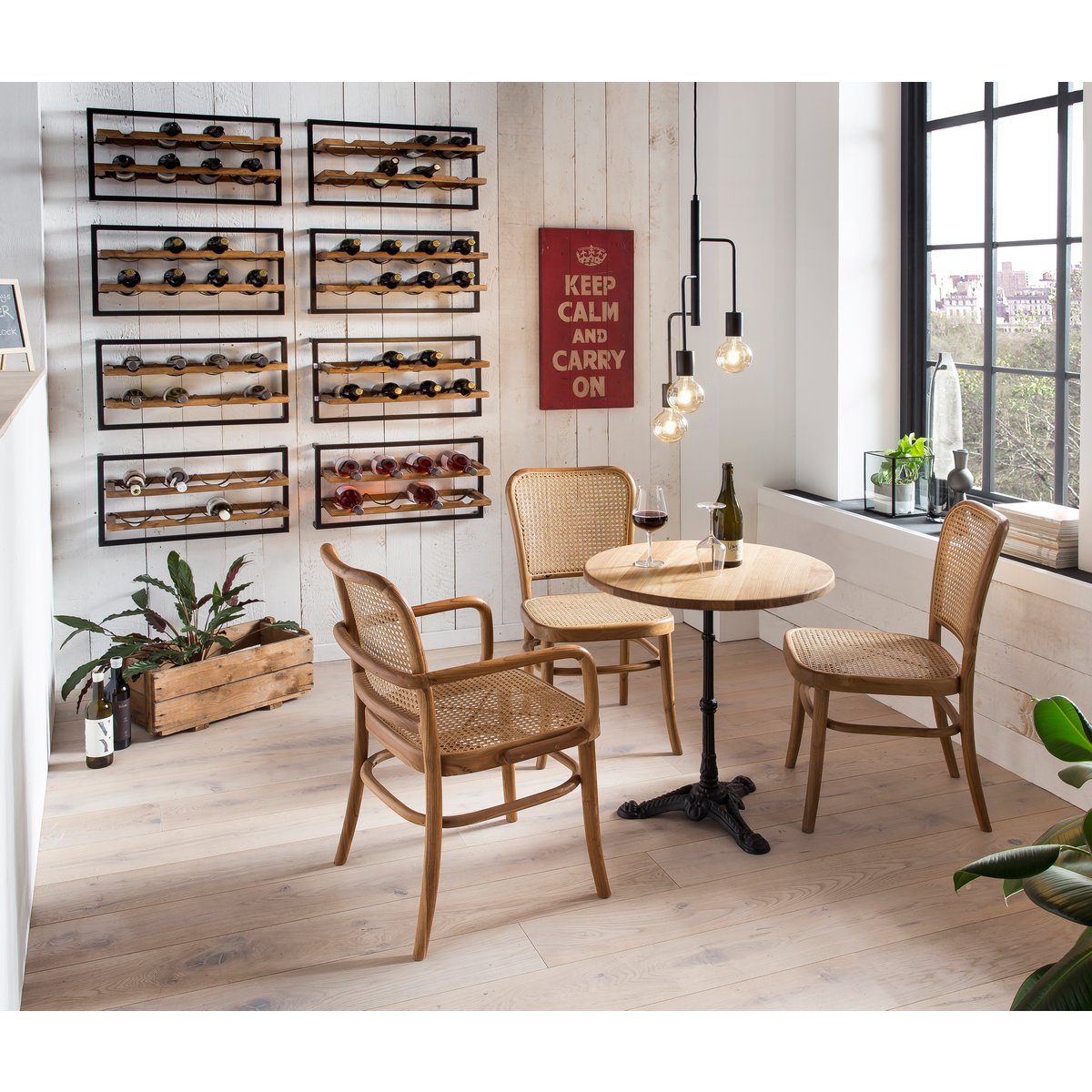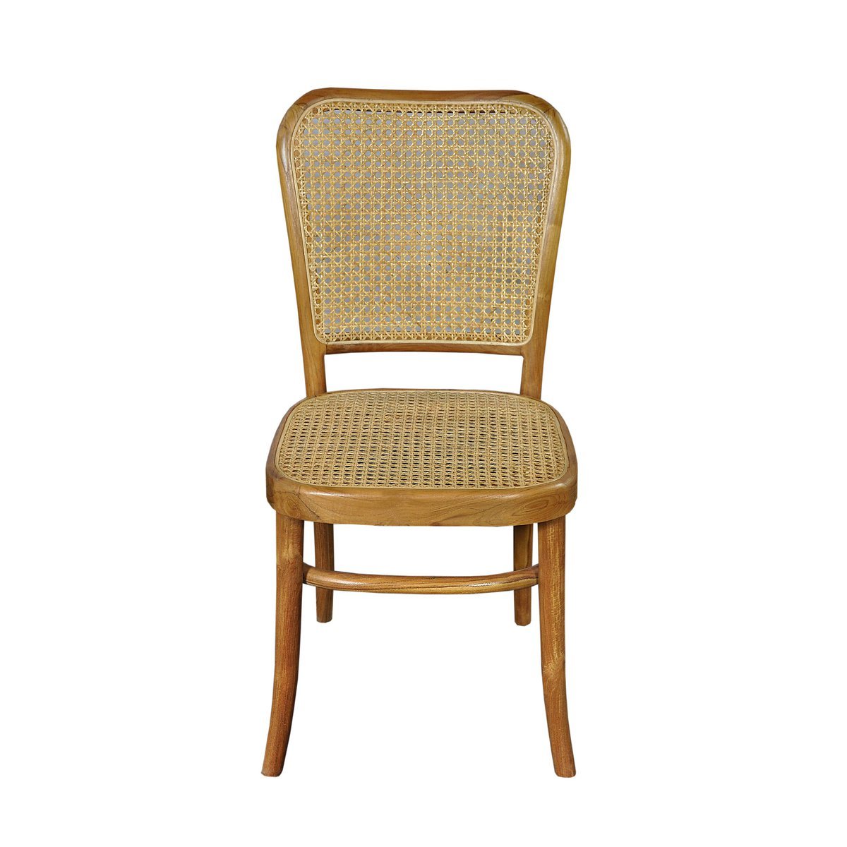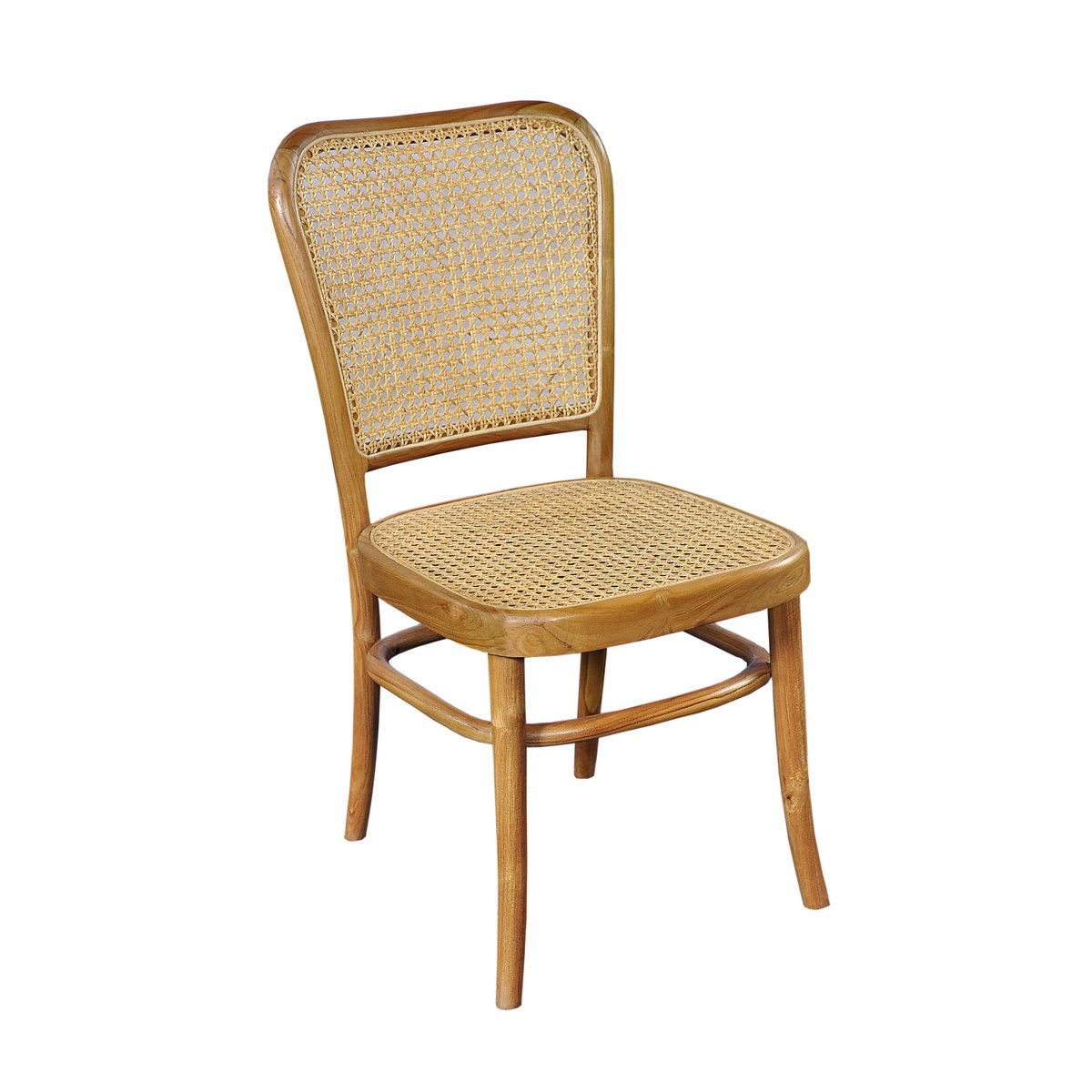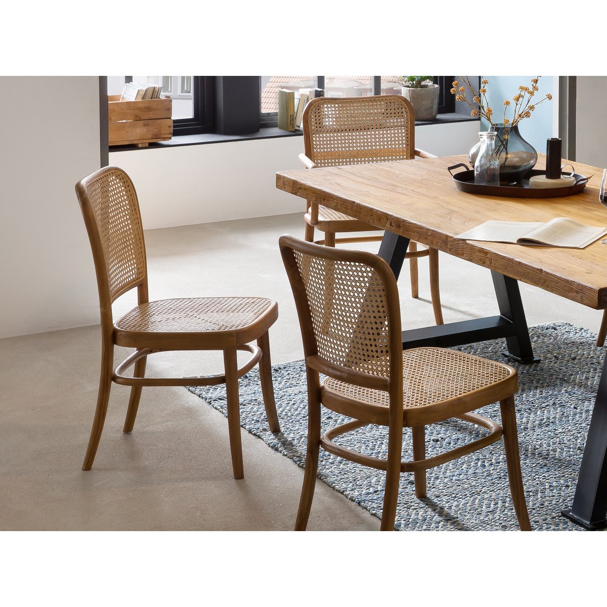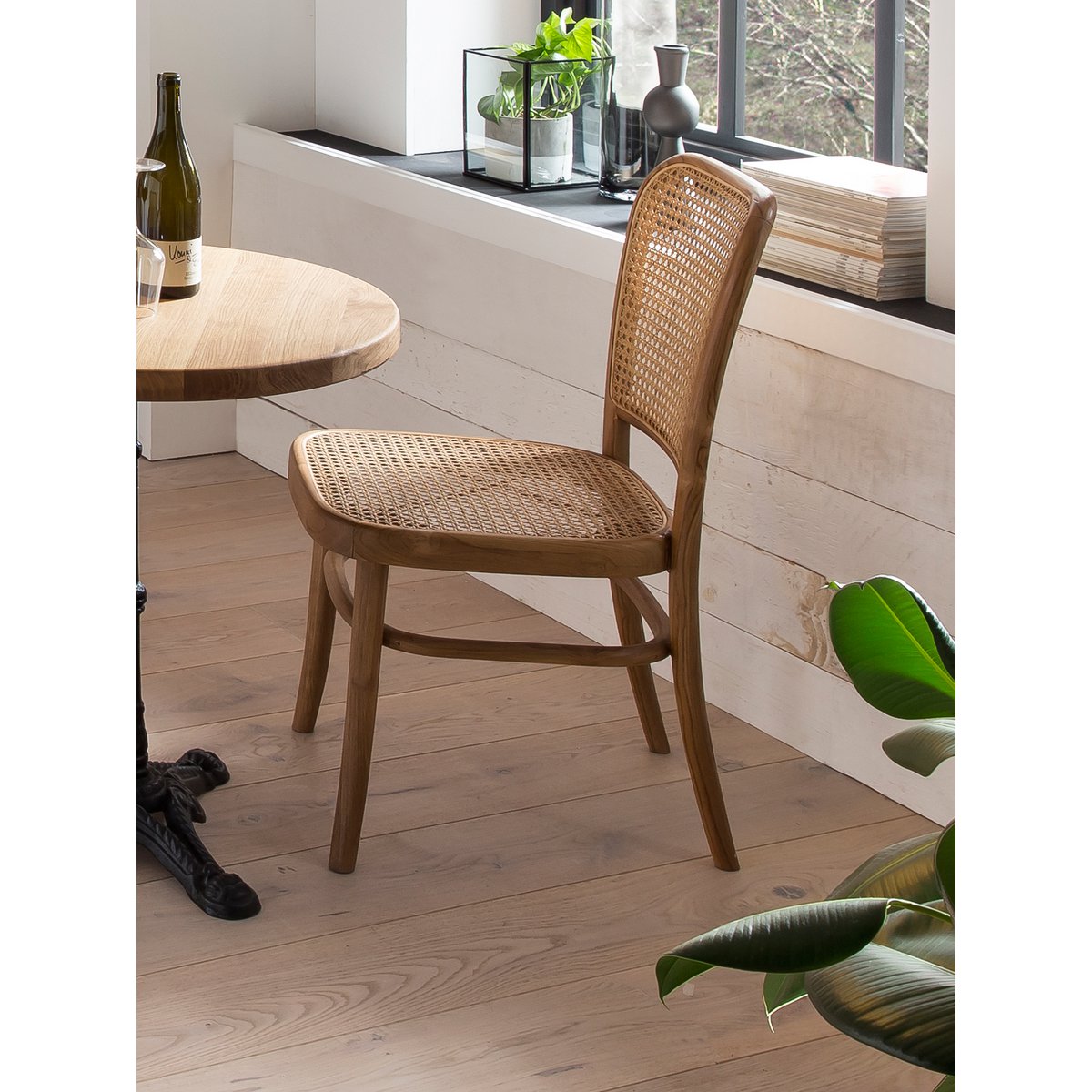 Das von sich aus schon edle Holz Teak, gestaltet mit einem Wiener Geflecht aus Peddigrohr in Sitz-und Rückenteil, ergibt einen wunderschönen Stuhl in der Farbe der Natur. Der Stuhl, welcher einem Kaffeehausstuhl gleicht, ist handgefertigt und passt sich dank seines warmen und exotischen Charmes jeden Wohnbereich an. Kombiniert zu Factory Design oder Vintage, antik und rustikal, diese Sitzgelegenheit passt immer. Dekoriert mit einem hübschen Kissen als Einzelstuhl im Gästezimmer oder Schlafzimmer. Im Esszimmer und Wohnbereich bietet er einen bequemen Sitzplatz für Ihre Gäste. In großen Dielen oder Fluren, auf der Terrasse oder im Wintergarten bietet dieser Stuhl mit seiner wunderschönen naturbelassenen Optik einen Platz zum Ausruhen. Sitzhöhe 46 cm, Sitztiefe 42 cm, Sitzbreite 44 cm.
