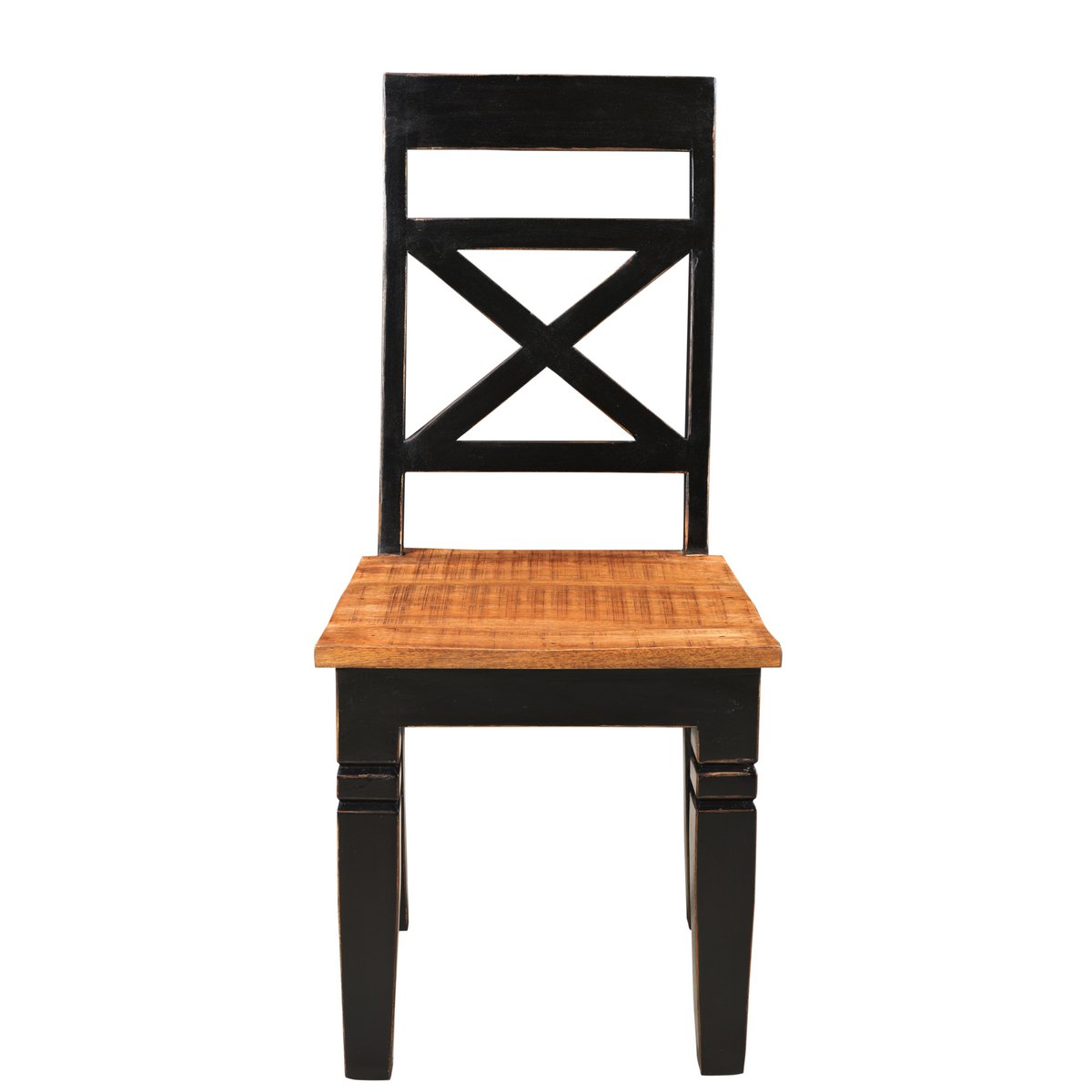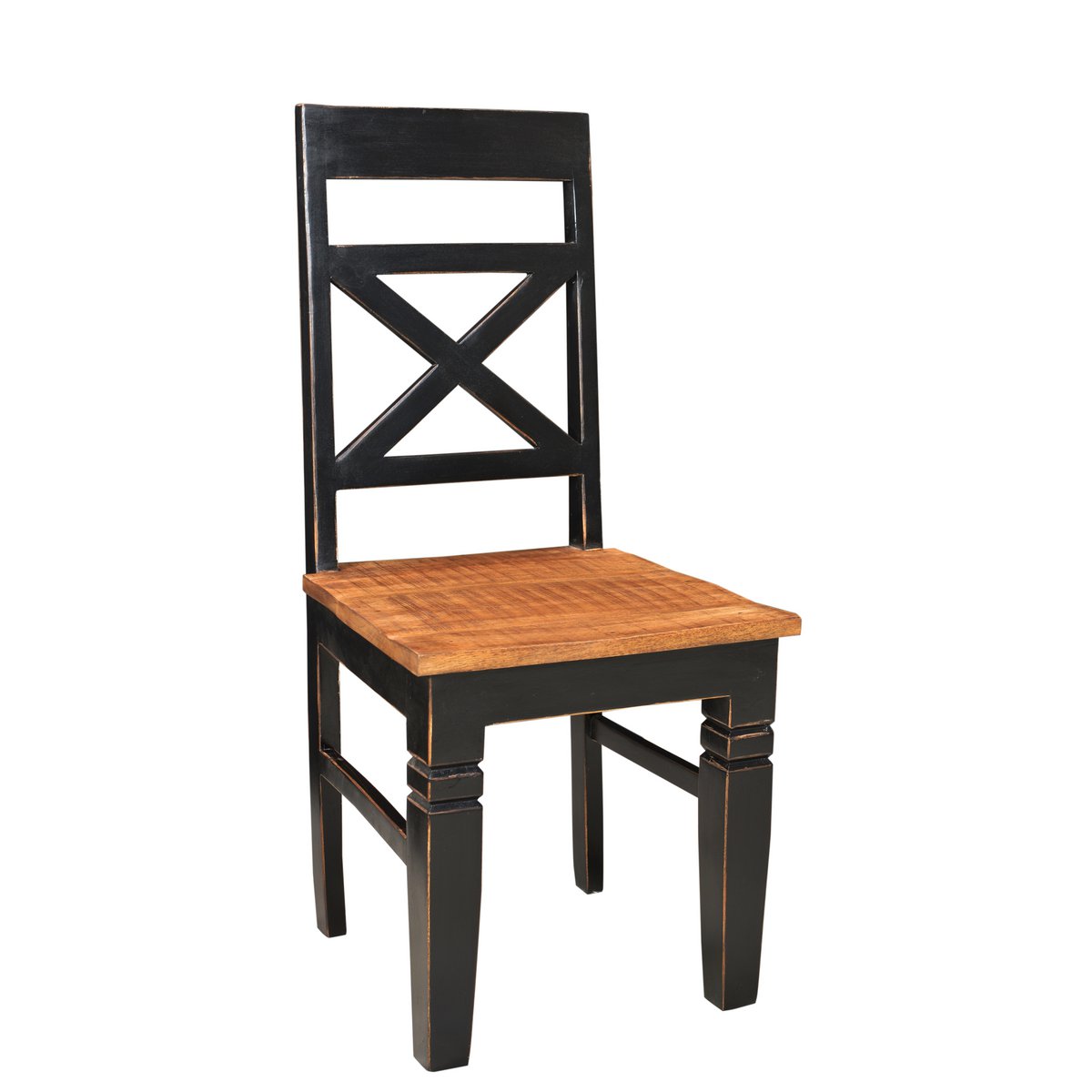 Mit diesem Stuhl machen Sie nichts falsch. Der Sitz steht in einem harmonischen Kontrast zu der fast schwarzen Rückenlehne. Die Sprossen in dem Rückenteil sind in Kreuzoptik dargestellt, auf eine Armlehne wurde hier zugunsten der bezaubernden Wirkung verzichtet. Das komplette Gestell des Sitzplatzes, insbesondere der Stuhlbeine, wurde aus massivem Mango-Holz gefertigt. Ob an der langen Tafel in Ihrem Esszimmer oder an kleineren gedeckten Tischen in der Küche, Ihre Tischgäste werden sich wohlfühlen und nicht so schnell aufstehen. Sitzhöhe 45 cm, Sitztiefe 42 cm, Höhe Rückenlehne 55 cm, Beinstärke 6x6 cm auf 4,5x4,5 cm, Beinhöhe 37 cm.