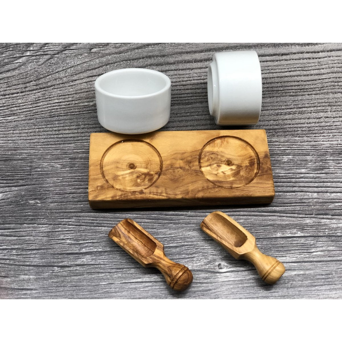 Verschiedene Salzsorten oder lieber Zimt & Zucker? Dieses aparte Tablett mit 2 kleinen Schälchen und Schippchen eignet sich wunderbar bei einem Buffet oder größeren Tischgesellschaften zum Selberwürzen. Auch als Dip-Schälchen zu verwenden für eine besondere Prise. Die zwei Schälchen aus Keramik stehen in einer Vertiefung auf einem kleinen schmalen Tablett aus Olivenholz und können so nicht so schnell verrutschen.