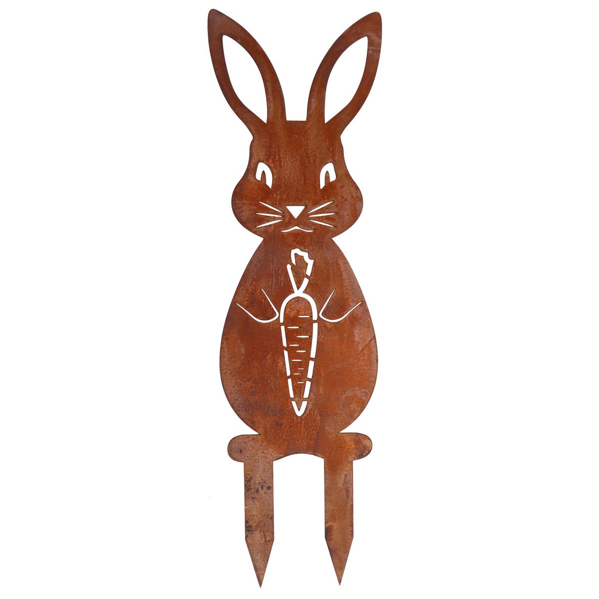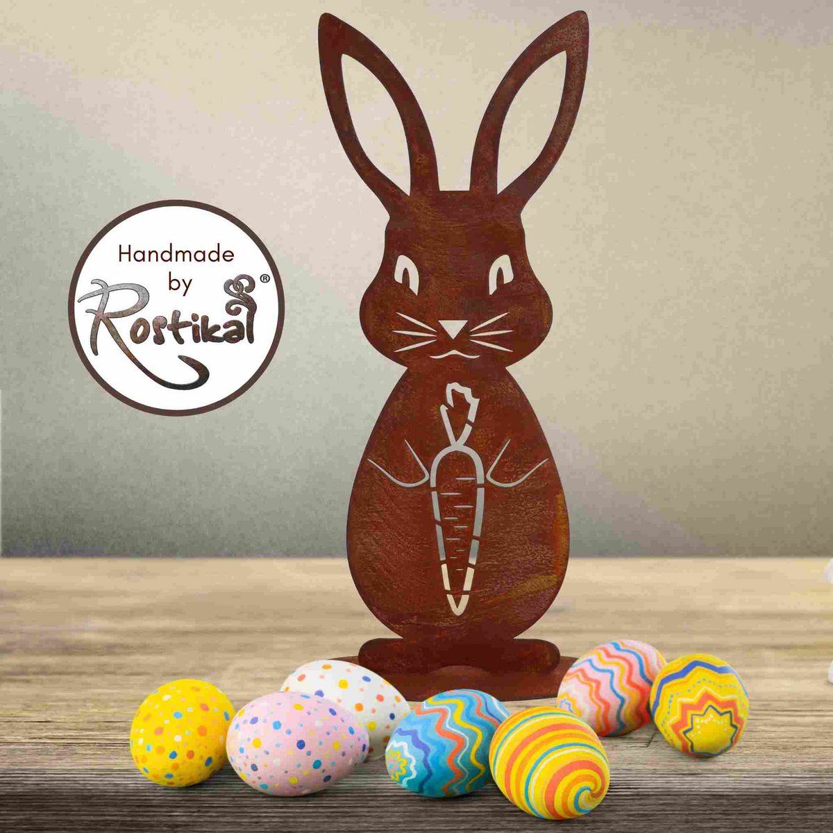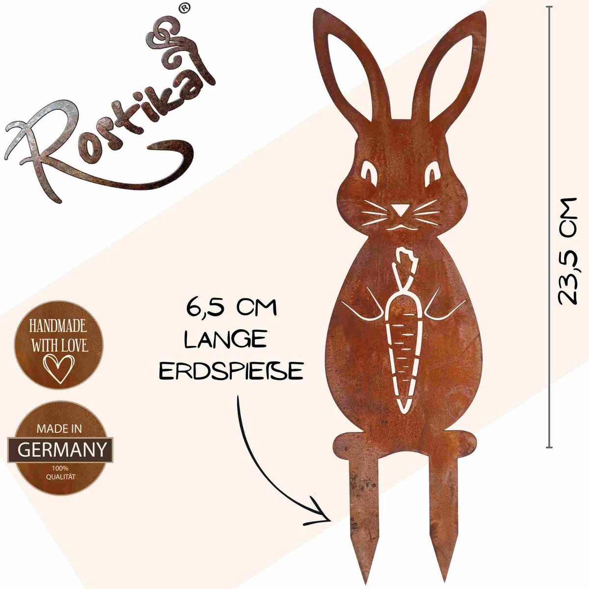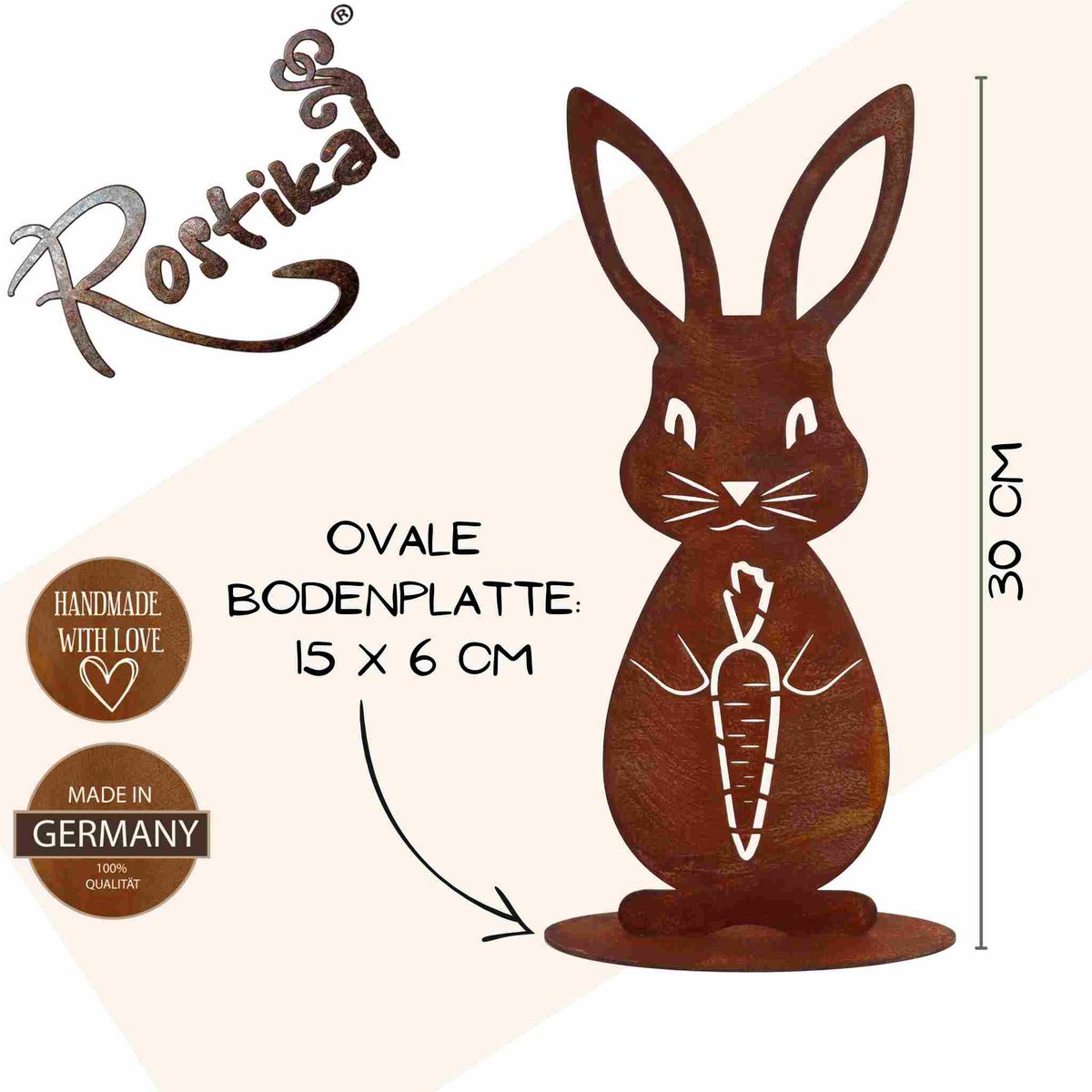 Rostiger Dekohase für den Garten - Ein Highlight für Ihre Osterdeko draußen. Entdecken Sie Karla Karotte, unseren rostigen Dekohasen, die perfekte Ergänzung für Ihre Osterdeko im Garten. Diese charmante Figur vereint die beliebten Trends von Rostdeko und Gartendeko aus Metall in einem einzigartigen Dekorationselement für den Frühling. ➤ Osterdeko Garten: Positionieren Sie Karla Karotte als zentrales Element Ihrer Frühjahrsdeko - zwischen blühenden Blumenbeeten, auf dem saftigen Rasen oder als charmanten Hingucker auf Ihrer Terrasse. Unsere Gartendeko im Edelrost-Design fügt sich harmonisch in jede Umgebung ein und versprüht eine festliche Atmosphäre. ➤ Flexibel & Wetterfest: Karla Karotte ist nicht nur ein Highlight für den Garten, sondern auch ideal als Teil Ihrer Tischdekoration oder als auffälliges Detail auf der Fensterbank. In Kombination mit Ostereiern bereichert sie Ihre Osterdeko-Ideen im Innen- und Außenbereich. Wählen Sie aus drei Varianten aus: 21 cm - auf Bodenplatte: Höhe: ca. 21 cm ✓ Breite: ca. 8 cm ✓ Bodenplatte: 11 cm x 4 cm ✓ 30 cm - auf Bodenplatte: Höhe: ca. 30 cm ✓ Breite: ca. 12 cm ✓ Bodenplatte: 15 cm x 6 cm ✓ zum Stecken: Höhe: 23,5 cm ✓ Breite: ca. 9 cm ✓ Erdspieße: 6,5 cm ✓ Gesamthöhe: 30 cm ✓ Eigenschaften: Jeder unserer Dekohasen, Karla Karotte, ist aus hochwertigem Stahlblech handgefertigt und mit einem speziellen Edelrost-Finish versehen, das ihr einen charakteristischen Vintage-Look verleiht. Diese Gartendeko im Vintage-Stil entwickelt über die Zeit eine natürliche Patina, die sie zum idealen Blickfang in Ihrem Garten macht. Ihre Vorteile: Einzigartige Osterhase Deko: Machen Sie Ihren Garten mit Karla Karotte zum Gesprächsthema. Vielseitige Einsatzmöglichkeiten: Ob als Teil Ihrer Garten Deko oder als stilvolle Ergänzung im Haus, diese Metalldeko-Figur ist vielseitig einsetzbar und langlebig. Handgefertigte Gartendeko Figuren: Jedes Stück ist ein handgefertigtes Unikat aus unserer eigenen Manufaktur in der Oberpfalz, wo Sie uns auch gerne vor Ort besuchen können. Ideal für jede Osterdekoration: Suchen Sie nach inspirierenden Osterdeko-Ideen oder einem besonderen Geschenk? Karla Karotte ist die perfekte Wahl für alle, die nach einer hochwertigen und charmanten Gartendeko-Figur suchen.