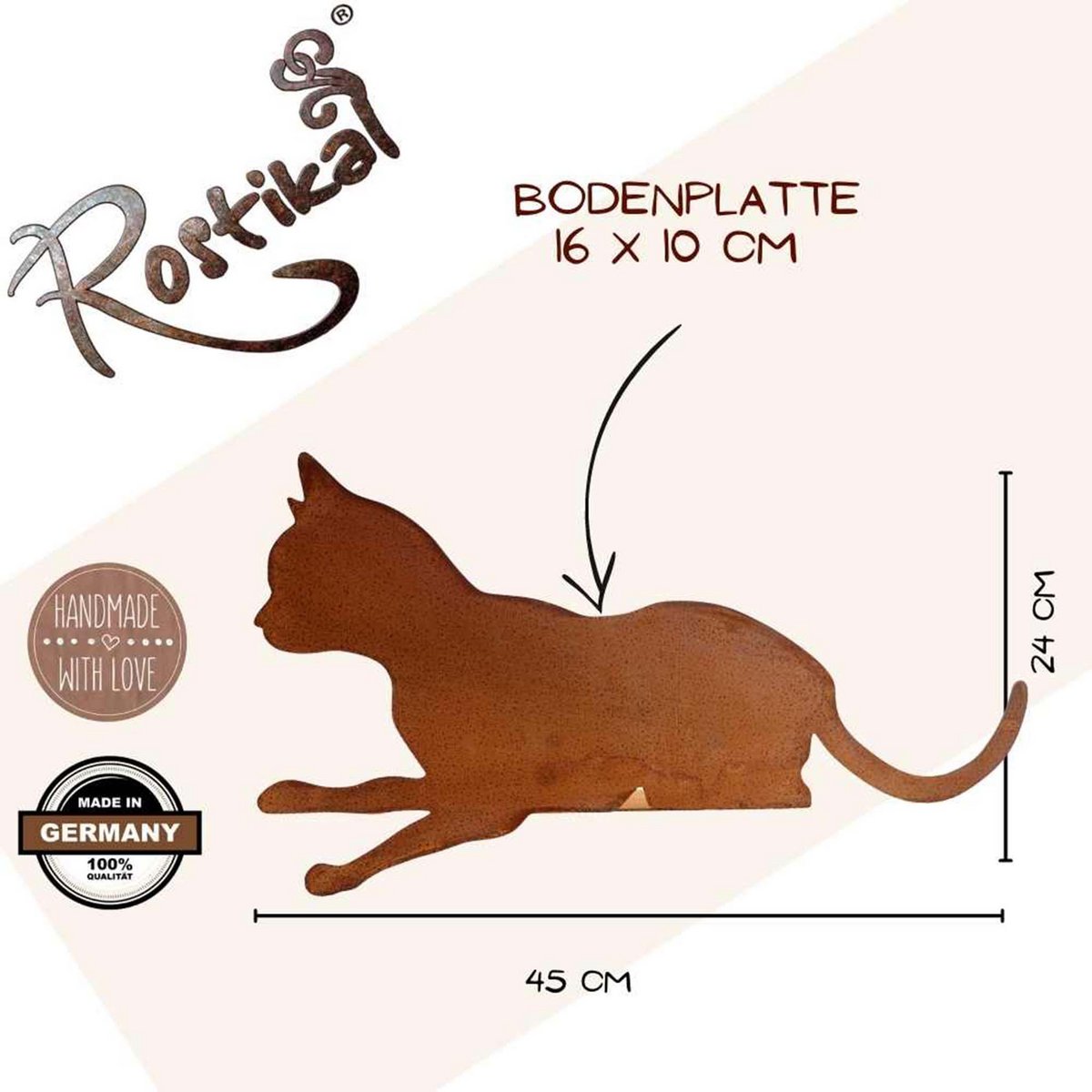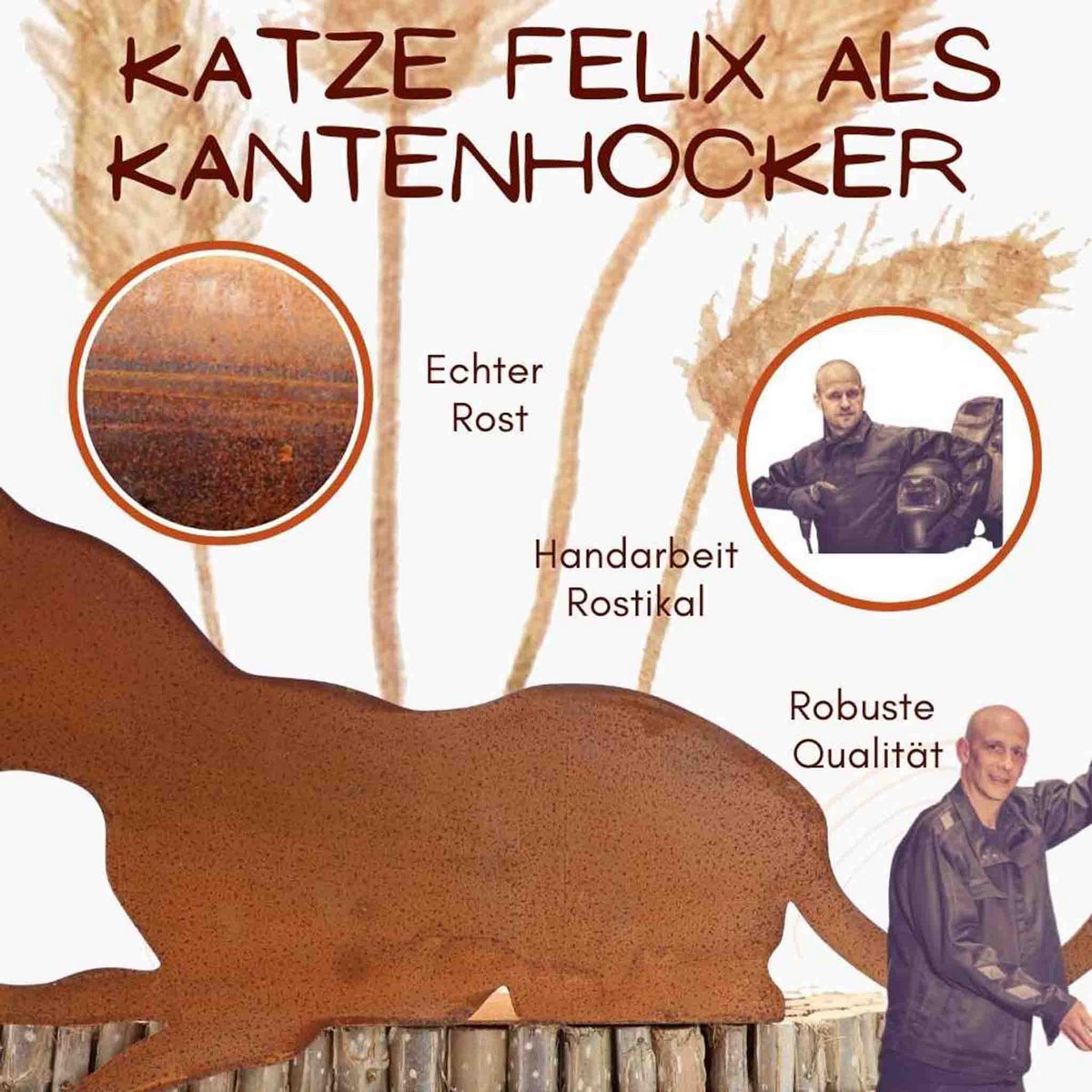 Rostdeko Kantenhocker Figur „Katze Felix“ für Ihre Garten und Zimmer Deko - ein toller HinguckerEntdecken Sie mit unserem Kantenhocker Katze Felix die perfekte Dekoration für Ihr Zuhause. Diese niedliche Metalldeko zaubert ein Lächeln ins Gesicht und eignet sich ideal zum Schmücken von Regalen, Schränken, Fensterbänken oder Tischkanten. Verwandeln Sie Ihr Wohnzimmer, Ihre Küche oder die Terrasse in ein echtes Highlight.Produktmaße: Länge: 45 cm ✓ Höhe: 24 cm ✓ Bodenplatte: 16 x 10 cm ✓ Eigenschaften:Die Metalldeko Katze Felix wurde mit viel Liebe zum Detail aus Metall gefertigt und erhält durch ein aufwändiges Edelrost-Finish ihre natürliche Rostpatina.Warum Sie uns wählen sollten: Entdecken Sie bei uns stets einzigartige Geschenkideen. Lassen Sie sich von unserer außergewöhnlichen Dekoration für das ganze Jahr inspirieren.