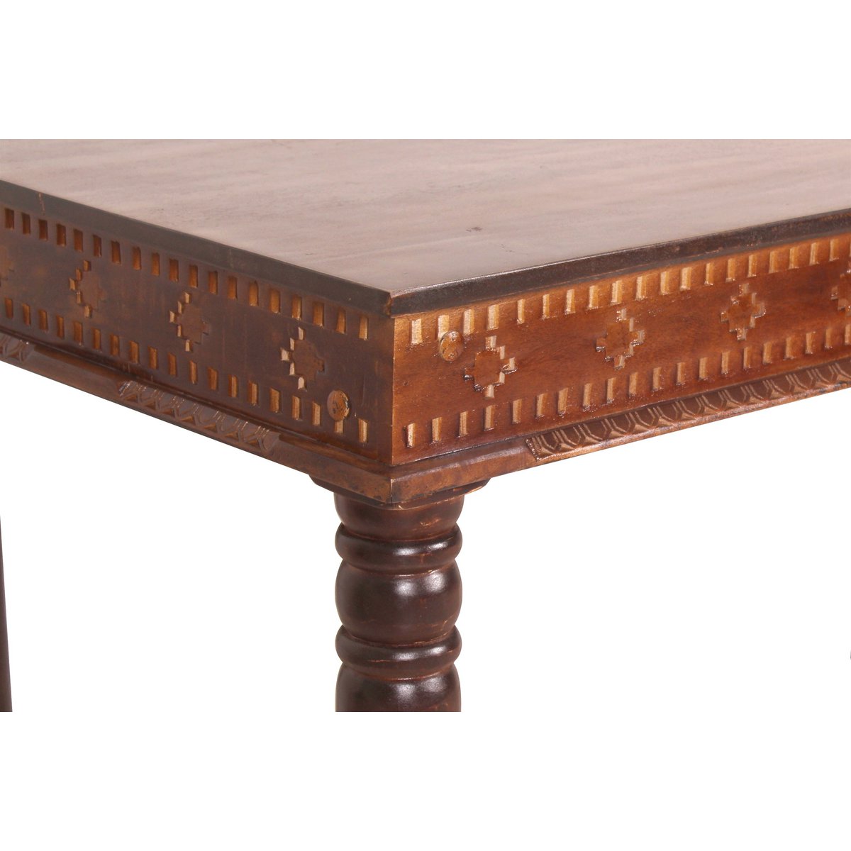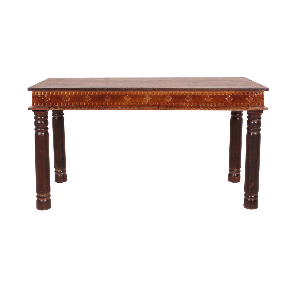 Dieser Tisch aus recyceltem Altholz besticht durch traditionelle Formen und aufwändige Schnitzereien. Der satte dunkelbraune Farbton des Altholzes passt hervorragend als Kontrast zu modernen Möbeln in zeitlosem weiß oder auch zu helleren Holztönen. Dieser Esstisch bietet genug Platz, um gemeinsam mit Freunden oder der Familie zusammenzusitzen. Ihr Essplatz wird so zum Eye-Catcher und Treffpunkt, um schöne Stunden zu verbringen. Plattenstärke 15 mm, Abstand Zarge bis Boden 66 cm.
