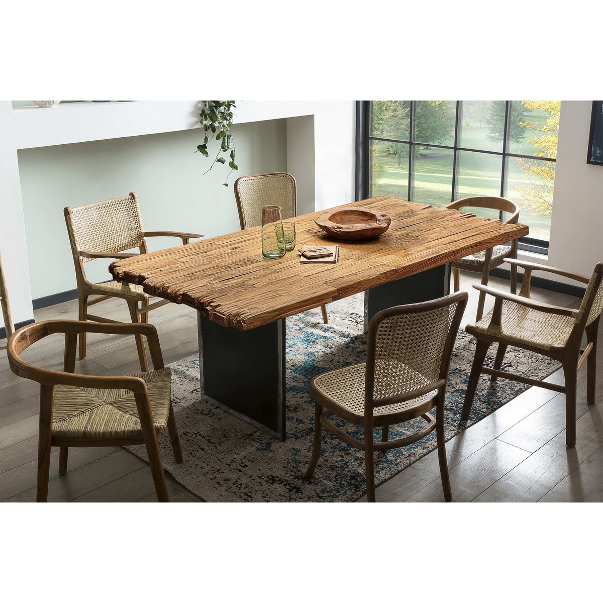 Mit diesem Esstisch mit Tischplatte wie gewachsen erwerben Sie die Möglichkeit einen Treffpunkt in Ihren Räumlichkeiten zu schaffen, der jedem Sofa den Rang ablaufen wird. Familie, Freunde, Gaumenschmaus, vielleicht sogar Home Office - Sie können sich selbst am besten ausmalen, wie hier der Alltag künftig aussehen wird. Jede Tischplatte ist wirklich einzigartig und Ausdruck von Individualität und Natürlichkeit. Und mit ein bisschen Pflege und Achtsamkeit werden Sie einen Freund fürs Leben haben. Das originelle Gestell aus Metall im Used-look bietet einen schönen Kontrast zur Tischplatte, sorgt für den angenehmen Industrial Style und verbindet Wohnlichkeit mit Coolness. Bestehend aus Gestell 07114-42 + Tischplatte 07179-03, Plattenstärke 25 mm auf 50 mm aufgedoppelt, mit Bruchkante an den kurzen Seiten, Gestell: Breite der Wangen 2 cm.