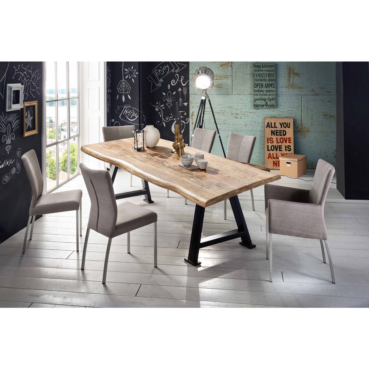Hier sind Sie richtig, wenn Sie einen Tisch mit Charakter und Einzigartigkeit wollen. Dieser Esstisch wird so leicht nicht noch einmal zu finden sein. Die Tischplatte wurde aus Mangoholz mit Baumkante wie gewachsen gefertigt und ist so einzigartig wie die Natur eben auch. Zudem überzeugt die Platte mit ihrer Stärke von insgesamt 56 mm. Das trendige A-Gestell aus Metall in antikschwarz bietet einen schönen Kontrast zur Tischplatte, sorgt für den angenehmen Industrial Style und verbindet Wohnlichkeit mit Coolness. Ihr Essplatz wird somit zum Eye-Catcher und Treffpunkt, um schöne Stunden mit Familie und Freunden zu verbringen. Hier findet viel mehr statt als nur die täglichen Mahlzeiten. Hinweis: Die Tischplatte ist ein Naturprodukt. Es kann zu Astlöchern, Wuchsrissen und unterschiedlichen Farbschmückungen kommen, welche jedoch kein Reklamationsgrund sind, sondern die Echtheit des Holzes unterstreichen. Plattenstärke aufgedoppelt auf 56 mm, Breite der Vierkantrohre 5 cm, Überstand 19cm.