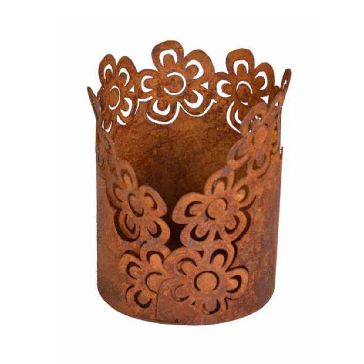 Rost Deko Windlicht mit Blumen - Metalldeko Laterne für Haus und Garten Das Blumen Deko Windlicht verzaubert Ihr Zuhause bei Dunkelheit und Tageslicht. Holen Sie sich die entzückende Rost Deko Laterne als Gartendeko auf die Terrasse oder als Zimmer Deko ins Wohnzimmer. ➤ Als Tischdeko oder für das Fensterbrett macht der Teelichthalter im Edelrost Design eine gute Figur. Maße: Durchmesser: 8 cm ✓ Höhe: 10 cm ✓ Eigenschaften:Aus Metall wird die filigrane Blumen Deko hergestellt. Ein Rost Finish sorgt für die besondere Farbgebung mit natürlichem Edelrost. So wird jedes Windlicht zum farblichen Unikat. Ihre Vorteile bei uns: Direkt online bestellen. Langlebige Qualität.