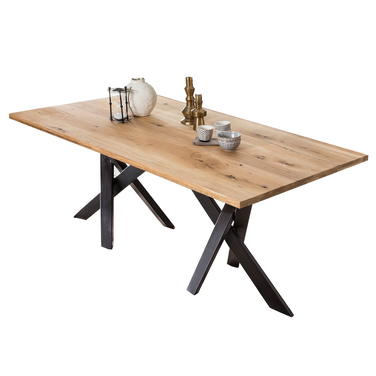 Hier sind Sie richtig, wenn Sie einen Tisch mit Charakter und Einzigartigkeit wollen. Dieser Esstisch wird so leicht nicht noch einmal zu finden sein. Die Massivholz Tischplatte wurde aus Wildeiche gefertigt und ist so einzigartig wie die Natur eben auch. Zudem überzeugt die Platte in natur mit ihrer Stärke von insgesamt 40 mm. Das moderne Metallgestell in antikschwarz bietet einen schönen Kontrast zur Natur-Tischplatte, sorgt für den angesagten Industrial Style und verbindet Wohnlichkeit und Coolness. Ihr Essplatz wird somit zum Eye-Catcher und Treffpunkt, um schöne Stunden mit Familie oder Freunden zu verbringen. Hier findet viel mehr statt als nur die täglichen Mahlzeiten. Hinweis: Die Tischplatte ist ein Naturprodukt. Es kann zu Astlöchern, Wuchsrissen und unterschiedlichen Farbschmückungen kommen, welche jedoch kein Reklamationsgrund sind, sondern die Echtheit des Holzes unterstreichen. Plattenstärke 20 mm auf 40 mm aufgedoppelt, aus durchgehenden Lamellen, Rechteckrohre 8x4 cm.