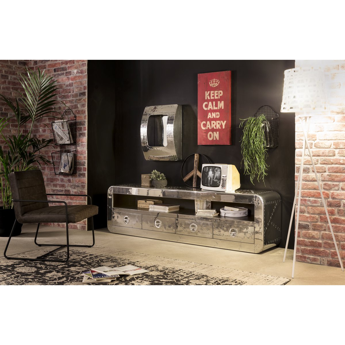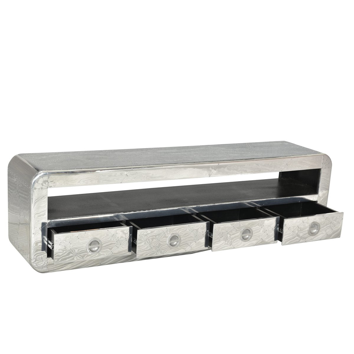 Das geräumige Lowboard im modernen Industrial Design bietet jede Menge Platz für TVs bis zu einer Größe von 70“. In dem offenen Fach finden weitere HiFi-Geräte Platz; Fernbedienungen, lose Kabel und weitere Kleinigkeiten lassen sich problemlos in einer der vier Schubladen verstauen. Die komplett mit Alu beschlagene Oberfläche des Boards geben dem Möbel einen coolen Spiegel-Look, welcher den Raum größer und heller wirken lässt. Die Metalloptik mit Zierschrauben erinnert an futuristische Flugzeugbauten oder modernste Fabrikgebäude. Das Lowboard verkörpert den angesagten Industrial Style durch und durch. Runde Metallbeschläge, inspiriert von schweren Tresortüren, bilden die Griffe der Schubladen. Scharniere und Schubladenführungen aus Metall sind optimal geeignet, um den Belastungen des Alltags Stand zu halten. Das Lowboard passt als origineller Kontrast in schlichte Einrichtungen oder aber harmoniert mit weiteren Möbeln der Serie in Flugzeug-Optik. Fachmaß 190x40x17 cm, Schubladeninnenmaß 39x32x12,5 cm.