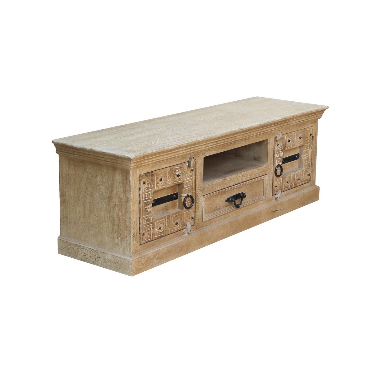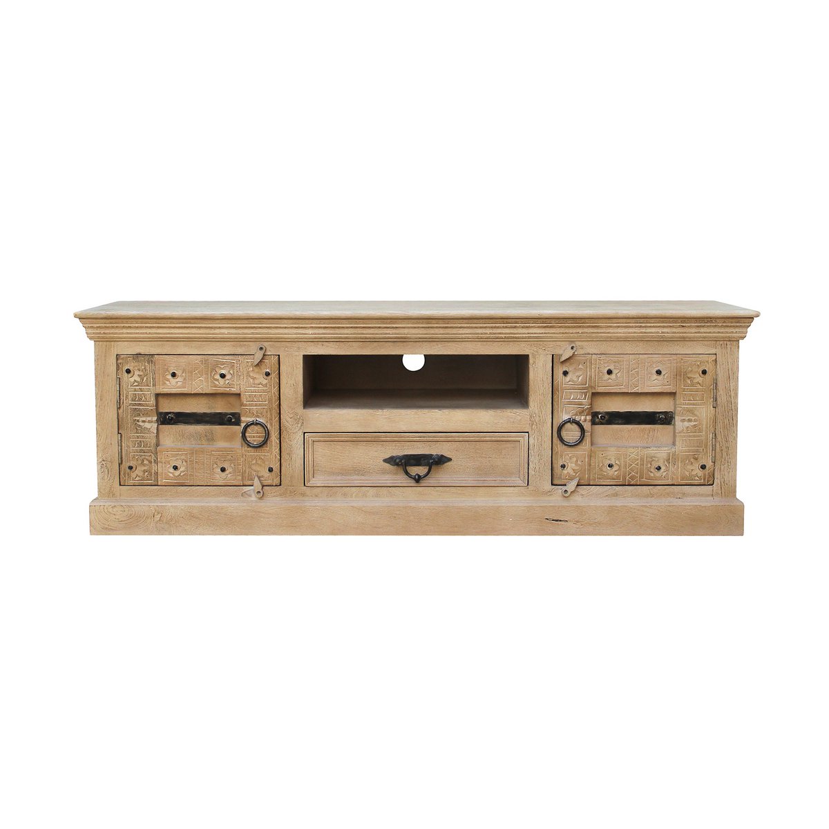 Ein Lowboard, welches Ihnen das Gefühl gibt, Ferien in Indien zu erleben. aufwändige Schnitzereien auf Mangoholz mit Metallapplikationen geben der Front des TV-Schranks den für Indien typisch antik kolonialen Look. Der handgefertigte Schrank bietet genügend Stauraum hinter 2 Türen, 1 offenem Fach sowie einem Schubkasten für DVD-Player, Spielekonsolen, Receiver, Verstärker, Fernbedienungen usw. Die TV-Kommode lässt sich durch entsprechende Accessoires wunderbar in Szene setzen und lässt die Schönheit der antik kolonialen anmutenden Multimedia-Kommode erst zur Geltung kommen. Gewollte Gebrauchsspuren geben dem Kommodenschrank einen zusätzlichen Reiz. Die Kommode kann sowohl in einem Wohnraum mit modernem Mobiliar und Wohnlandschaften kombiniert werden und ihren Charme zum Ausdruck bringen. Fachmaß 50x40x11 cm, Schubladeninnenmaß 47x33x10 cm, hinter den Türen 1 fester Boden, Fachmaße BT 42,5x37, Höhe oben 16 cm und unten 13 cm, Schubladenschienen aus Holz.