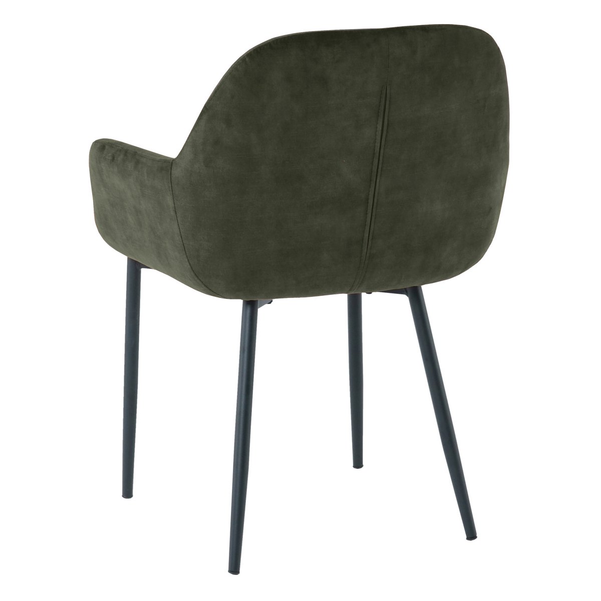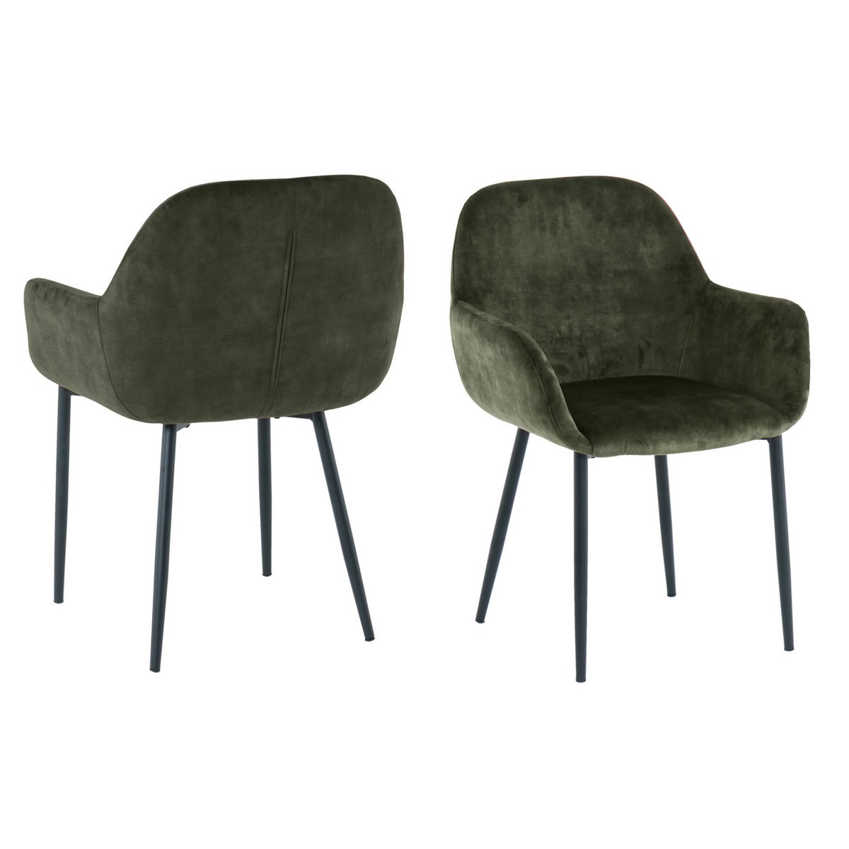Dieser kompakte Armlehnstuhl überzeugt durch seinen schmeichelnden Samtbezug und eine hohe Bequemlichkeit. Er bietet großen Sitzkomfort und ist zudem auch optisch ein echter Blickfang. Der Samtbezug bildet einen schönen Kontrast mit den matt schwarzen Beinen aus pulverbeschichtetem Metall. Der leicht gerundete Rücken und die ausgestellten Armlehnen schmiegen sich ihrem Körper perfekt an. Dieser Armlehnstuhl lädt zum Verweilen ein. Egal ob am Esszimmertisch oder am Wohnzimmertisch, er ist immer die perfekte Lösung. Sitzhöhe ca. 47 cm, Sitzbreite ca. 40 cm, Höhe der Armlehnen ca. 62 cm, Abstand zwischen den Beinen vorne ca. 43 cm, Abstand zwischen den Beinen seitlich ca. 44 cm, Ø Beine oben ca. 2,5 cm, Ø Beine unten ca. 1,5 cm, Bezug 100% PES, Pilling 4.5, Scheuertouren >40.000, Lichtbeständigkeit 4.0, Farbbeständigkeit 4.0
