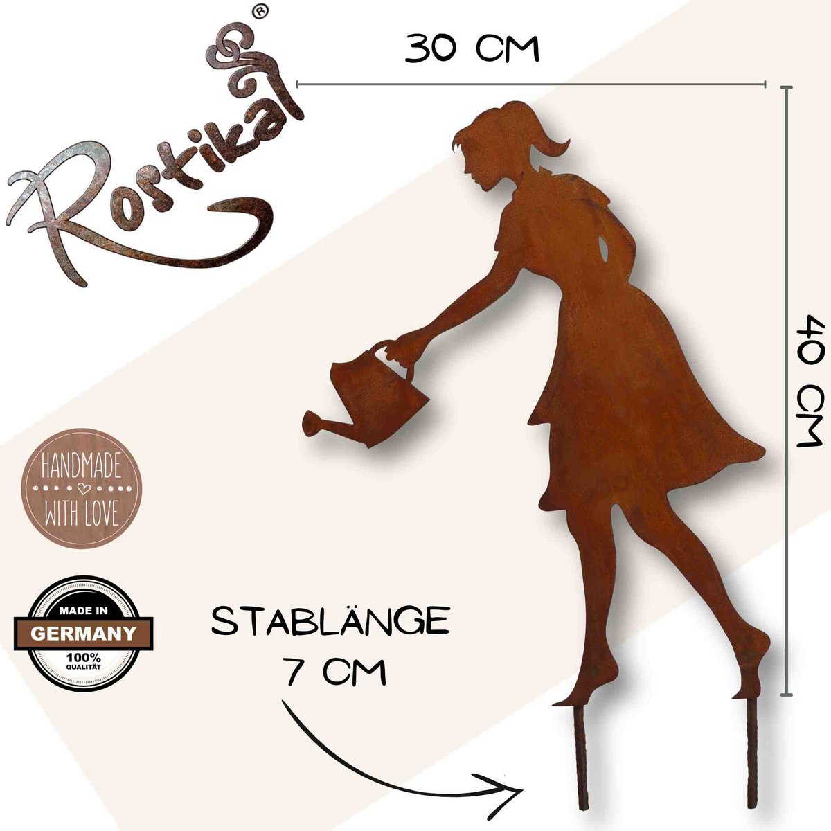 Die Metalldekoration Gärtnerin "Gisela" ist ein romantischer Blickfang in Beet, Rasen oder Pflanztopf.Die Mädchenfigur mit der Gießkanne in der Hand zaubert dem Betrachter ein Lächeln ins Gesicht. Holen Sie sich das Rost Dekoaccessoire als Wohn- oder Gartendeko in Ihr Zuhause. Platzieren Sie die lebensgroße Edelrost Figur in Ihrem Garten, um eine ausgefallene Gartendeko zu schaffen oder nutzen Sie sie als originelle Gartenfigur, die alle Blicke auf sich zieht.Wählen Sie aus vier Varianten aus:Höhe: 40 cm mit Bodenplatte: Figur Höhe: 40 cm ✓ Figur Breite: 30 cm ✓ Bodenplatte: 18 cm Durchmesser ✓ Höhe 40 cm auf Stab: Figur Höhe: 40 cm ✓ Figur Breite: 30 cm ✓ Stab Länge: 7 cm ✓ Höhe 60 cm mit Bodenplatte: Figur Höhe: 60 cm ✓ Figur Breite: 45 cm ✓ Bodenplatte: 28 cm Durchmesser ✓ Höhe 60 cm auf Stab: Figur Höhe: 60 cm ✓ Figur Breite: 45 cm ✓ Stab Länge: 20 cm ✓ Eigenschaften:Das Dekoaccessoire wird aus Metall gefertigt. Für den stabilen Stand ist eine runde Bodenplatte angeschweißt oder die Metallfigur steht auf zwei Stäben. Der shabby chic Look entsteht durch die Behandlung mit einem speziellen Rost-Finish. Ihre Vorteile bei uns: Bestellen Sie bequem direkt online. Verschenken Sie wahre Freude mit unserer Rostdeko aus Metall. Sie liegen mit Edelrost Dekoration absolut im Trend.