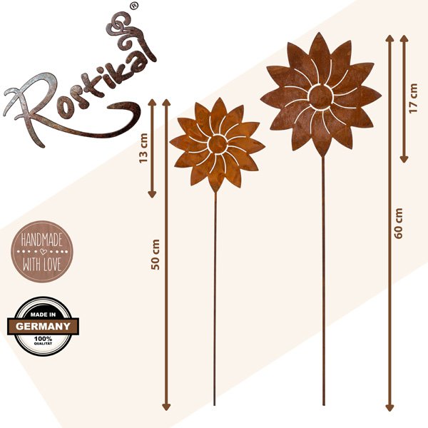 Gartendeko Vintage Blume zum Hängen - Moderne Dekoblumen als Hängedeko oder auf StabMit den rustikalen Metallblumen Deko in Rostoptik sind Ihrer Kreativität keine Grenzen gesetzt. Bestellen Sie die Metallblumen Deko zum Hängen und dekorieren Sie z.B. Ihr Fenster damit. Oder stecken Sie die Metallblumen Deko auf Stab einfach als Gartenstecker ins Blumenbeet.➤ Kreativ-Tipp: Kombinieren Sie für den WOW-Effekt Ihrer Zimmer Deko mehrere Blüten in verschiedenen Größen. Ihre Gäste werden Augen machen. Wählen Sie aus vier Varianten: Blüten-Ø: 13 cm:zum Hängen: Blüte mit Lochbohrung zum Aufhängen ✓zum Stecken: Ø Stab: 3 mm ✓ Stablänge: 37 cm ✓ Gesamtlänge: 50 cm ✓ Blüten-Ø: 17 cm:zum Hängen: Blüte mit Lochbohrung zum Aufhängen ✓zum Stecken: Ø Stab: 4 mm ✓ Stablänge: 43 cm ✓ Gesamtlänge: 60 cm ✓ Eigenschaften:Die Metallblumen Dekoration erhalten Sie mit Lochbohrung - Die Gartenstecker auf einem Stab. Hergestellt werden die Vintage Deko Blüten aus Metall. Durch ein Rost Deko Finish entsteht der besondere Shabby Chic Deko.Ihre Vorteile bei uns: Verschenken Sie wahre Freude mit den Edelrost Blumen von Rostikal. Sie erhalten handgemachte Qualitätsware made in Germany.