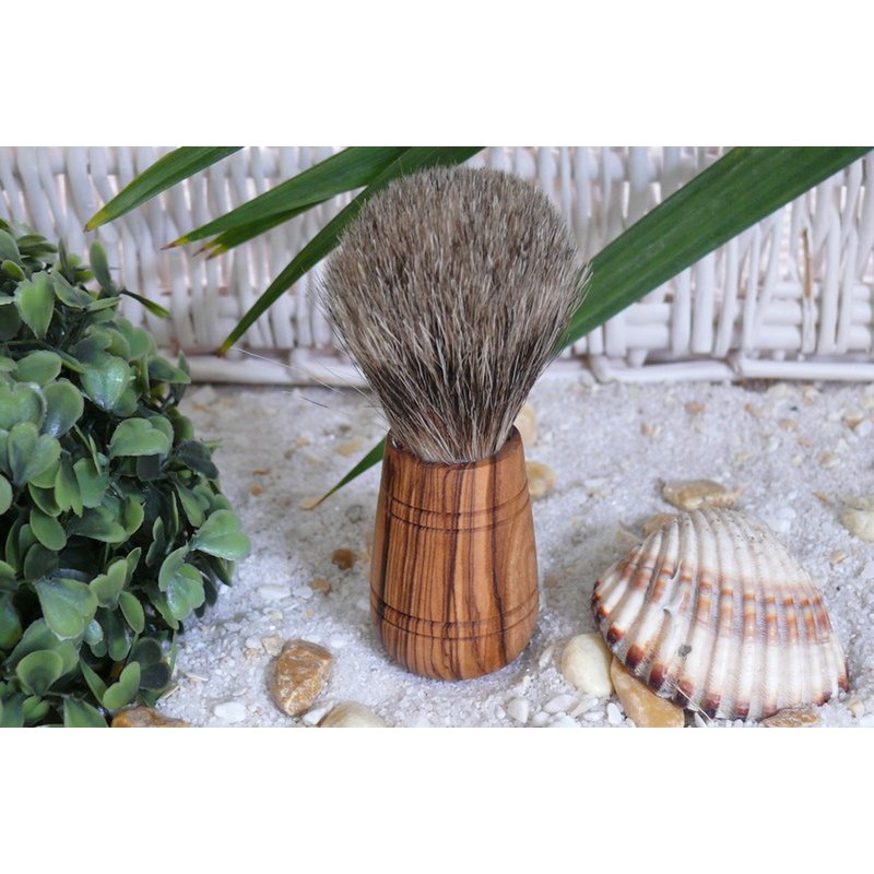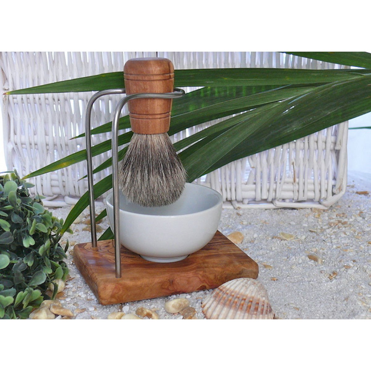 Modern und futuristisch ist dieser Rasierpinselhalter auf einer Platte aus Olivenholz für höchste Ansprüche bei der Nassrasur. Der Rasierpinsel besteht aus Zupf echtem Dachsrückenhaares und ist auf einem Griff aus gedrechseltem Olivenholz fixiert. Lassen Sie Ihren Rasierpinsel in dem Rasierpinselhalter überkopf trocknen. Dies ist besonders schonend, da sich die Feuchtigkeit nicht dort sammelt, wo die Haare gebündelt sind. Somit ist eine lange Lebensdauer Ihres Rasierpinsels garantiert. Ein sehr wertiges Geschenk für den Mann und wunderbar zu kombinieren mit einer Rasierdose aus Olivenholz. Größe/Maße/Gewicht Rasierpinselhalter DESIGN Höhe ca. 13 cm Länge ca. 12 cm Breite ca. 8 cm Rasierschale Porzellan (rund) Höhe ca. 4,5 cm Durchmesser ca. 8,5 cmRasierpinsel Länge ca. 9 cm Durchmesser ca. 3,5 cm