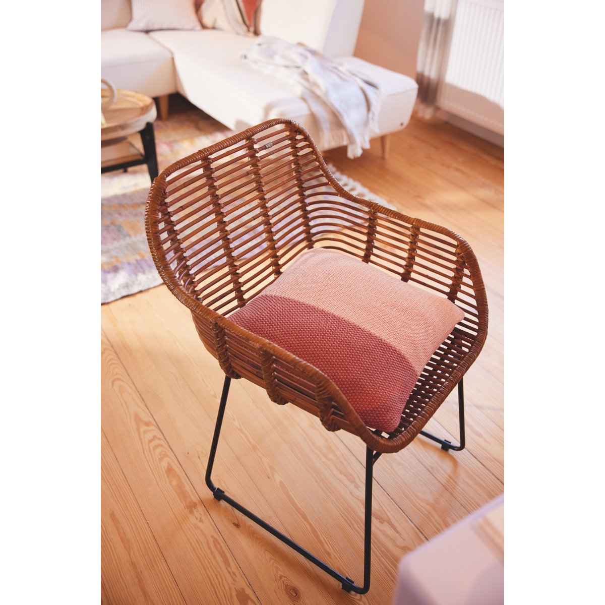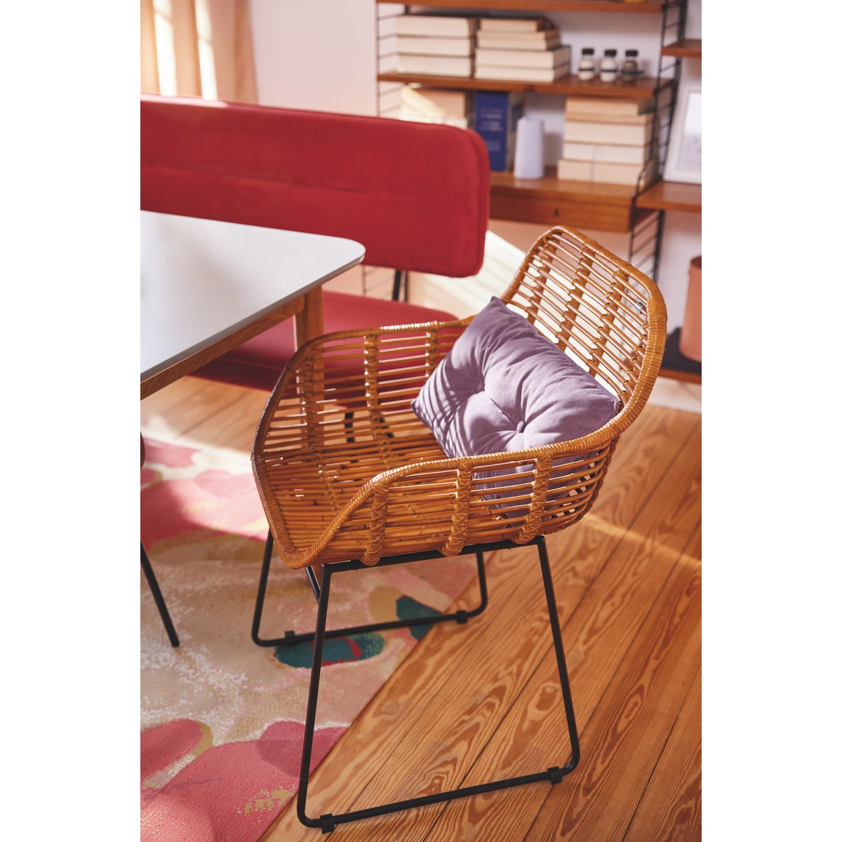 Die Marke Tom Tailor steht für Nachhaltigkeit und Reduzierung der Umweltbelastung. Mit schnell nachwachsenden Rohstoffen kann man in der Möbelbranche nichts falsch machen. Dieser Rattan-Stuhl, ausgestattet mit einem schwarzen Kufengestell aus Metall, wird handgefertigt und passt sich dank seines warmen und exotischen Charmes jeden Wohnbereich an. Kombiniert zu factory Design oder Vintage, antik und rustikal, dieser Armlehnstuhl passt immer. Dekoriert mit einem hübschen Kissen als Einzelstuhl im Gästezimmer oder Schlafzimmer. Im Wohnbereich oder Esszimmer bietet er einen bequemen Sitzplatz für Ihre Gäste. In großen Dielen oder Fluren, auf der Terrasse oder im Wintergarten bietet dieser Korbstuhl mit seiner wunderschönen naturbelassenen Optik einen Platz zum Ausruhen. Das Rattan-Geflecht des Stuhls ist dicht strukturiert, formschön dargestellt und stabil. Am Geflecht des Rückenteils sehr dezent angebracht, befindet sich das Logo der Marke Tom Tailor. TOM TAILOR Metallring oben rechts. Sitzhöhe 46 cm, Sitzbreite 45 cm, Sitztiefe 46 cm, Armlehnhöhe 66 cm.